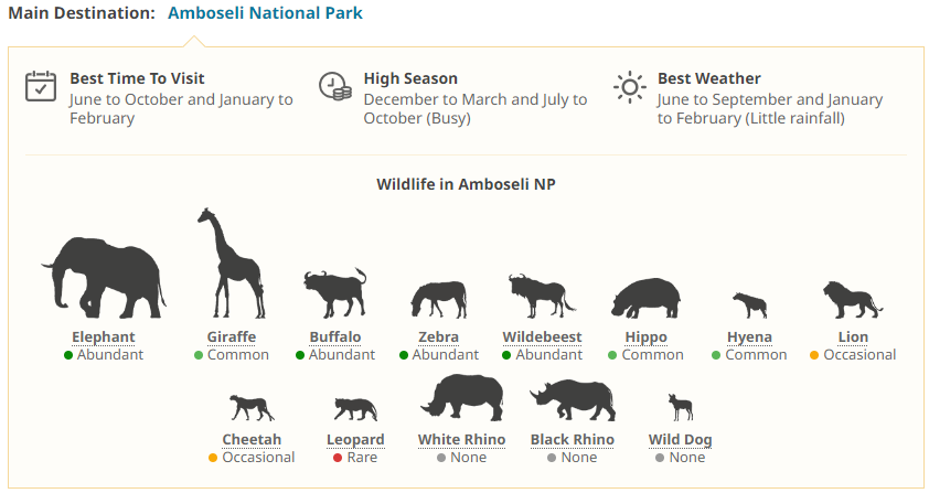 You will start your trip in Nairobi and end your trip in Mombasa, Kenya. You will visit Amboseli and Tsavo East. We will also book a beach holiday for you, either on the north coast or the south coast. You have the option between budget accommodation or luxury accommodation on this tour, and we can provide quotes for a group, family, and solo travelers.